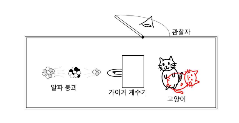 실험의 내용은 다음과 같다. 상자 안에는 시간 당 50%의 확률로 붕괴하는 라듐핵과 핵이 붕괴하여 방출하는 $\alpha$입자를 검출하는 가이어 계수기, 그리고 망치와 독약을 넣은 유리병, 고양이가 있다. 만일 가이어 계수기가 $\alpha$입자를 검출하면 망치가 유리병을 깨서 고양이가 죽게 된다. 이때 1시간이 지난 뒤 고양이는 살았을까, 죽었을까?